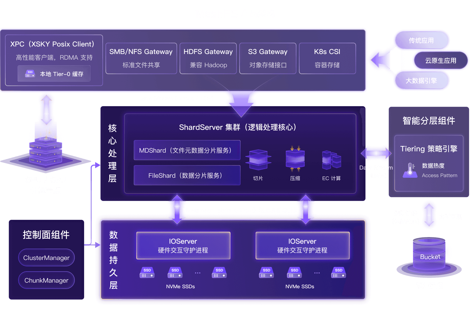 透明分层 (Tiering):基于策略自动将冷数据下沉至低成本对象存储 ,保留目录结构,访问时自动召回。实现“全闪存性能 + 对象存储成本”的最优组合。