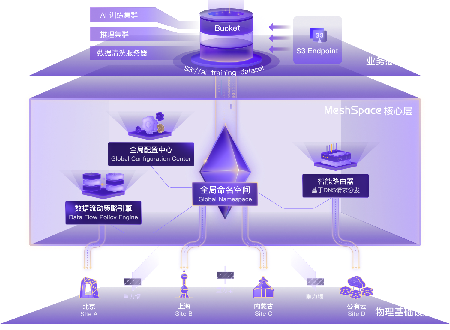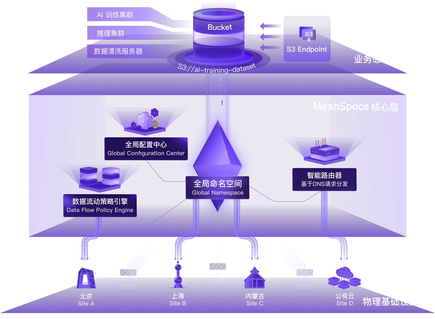 MeshSpace 全局命名空间让两地看到同一份数据视图。北京团队读取时,系统自动从上海回源,实现“数据不动,逻辑互通”。